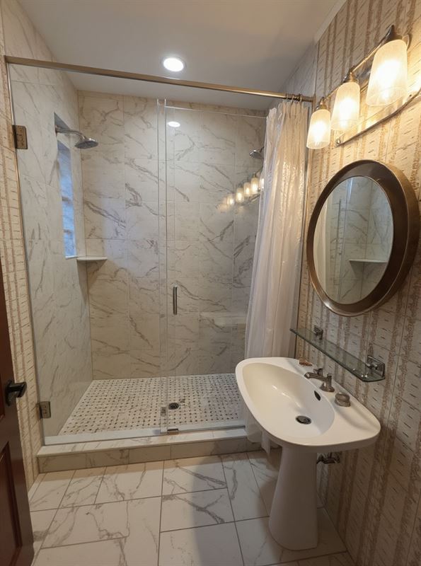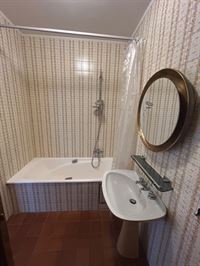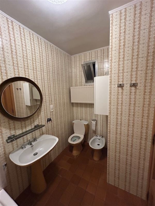 De badkamer is functioneel ingericht met een volledig bad, wastafel en toilet. De tegels zorgen voor een retro uitstraling die met wat creativiteit kan worden omgetoverd tot een moderne, persoonlijke ruimte.
