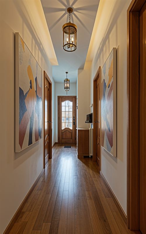 De gevel van het gebouw straalt een tijdloze charme uit, geïntegreerd in een straatbeeld met zowel klassieke als moderne architectuur. Eenmaal binnen valt het grote raam in de woonkamer op dat zorgt voor veel natuurlijke lichtinval en een aangename sfeer. De woonkamer met authentieke haard biedt genoeg ruimte voor een comfortabele zit- en eethoek.
