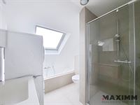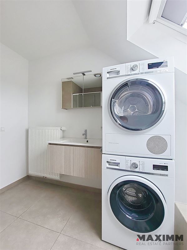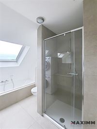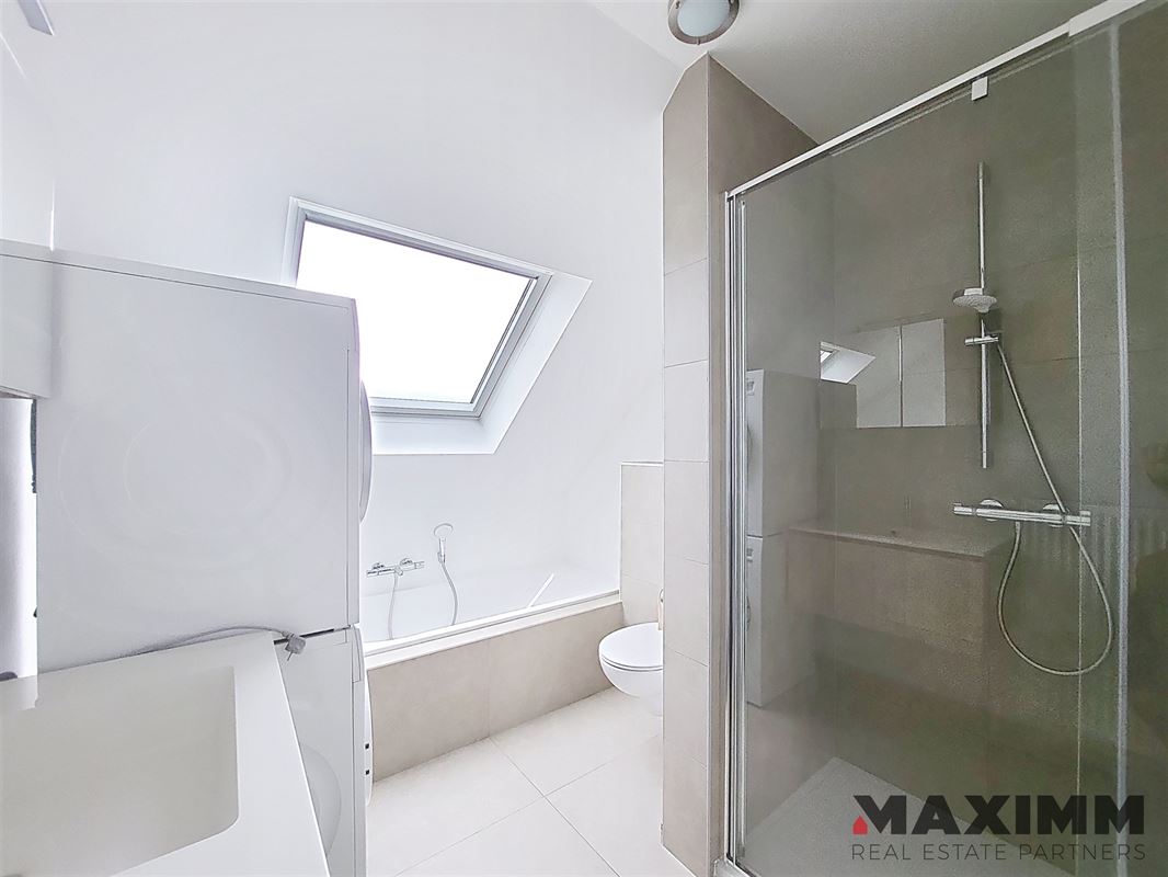 De badkamer is modern en functioneel, uitgerust met een ruime douche en een ligbad onder dakraam, plus een wastafel en een hangtoilet. In de nabijheid vind je ook een ruimte met wasmachine voor extra comfort.