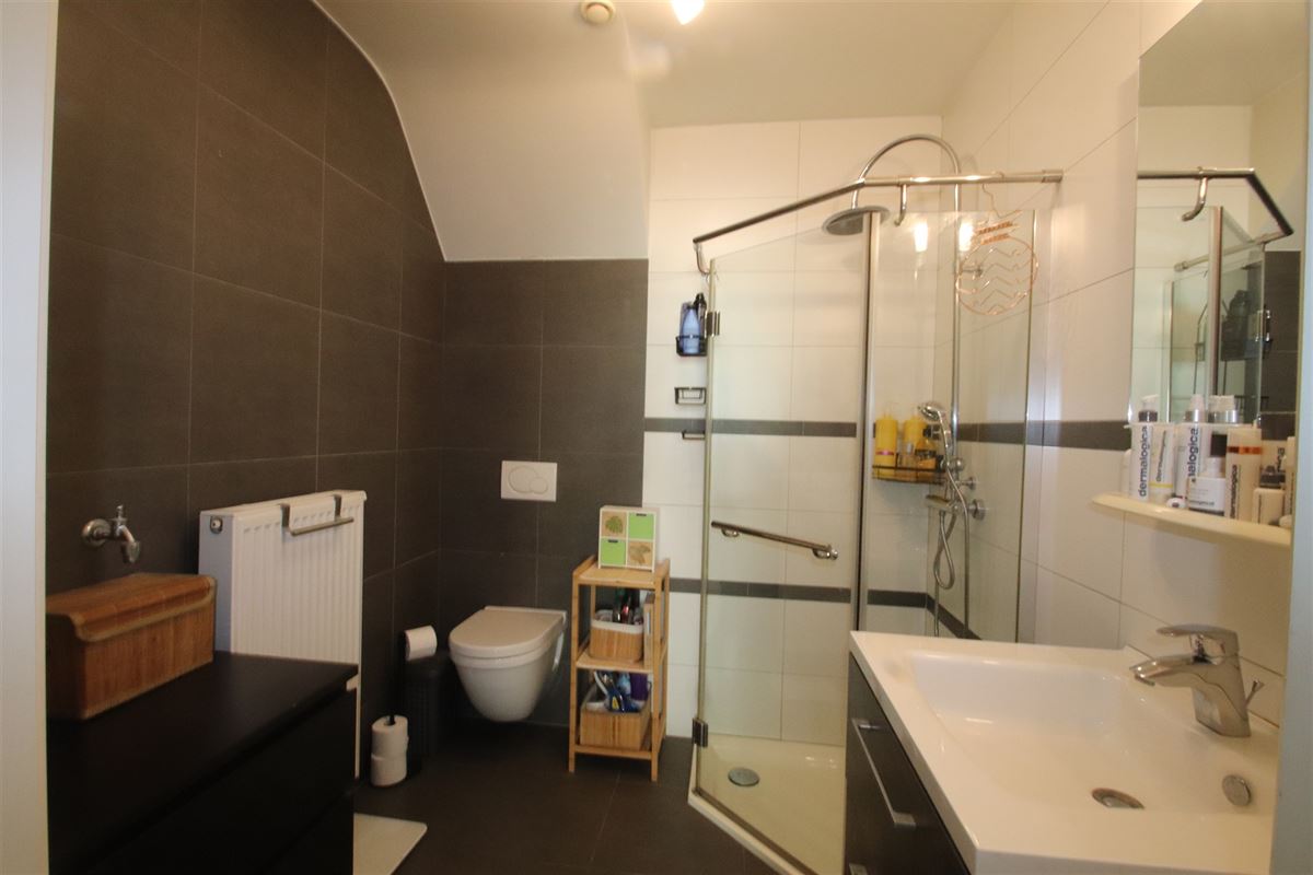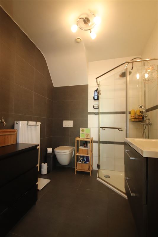 Een praktische aparte badkamer is voorzien van een doucheruimte, een enkele lavabo, een apart toilet en aansluitingen voor de wasmachine en de droogkast.